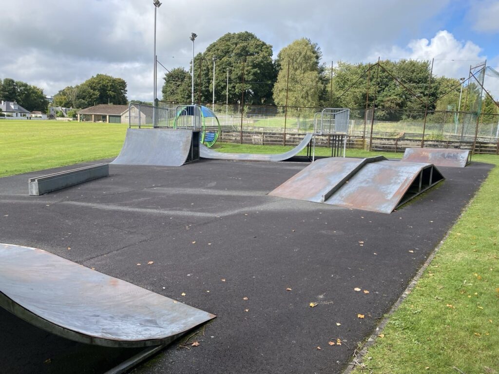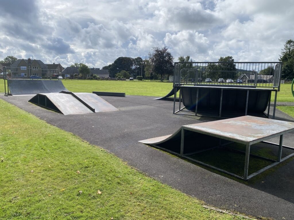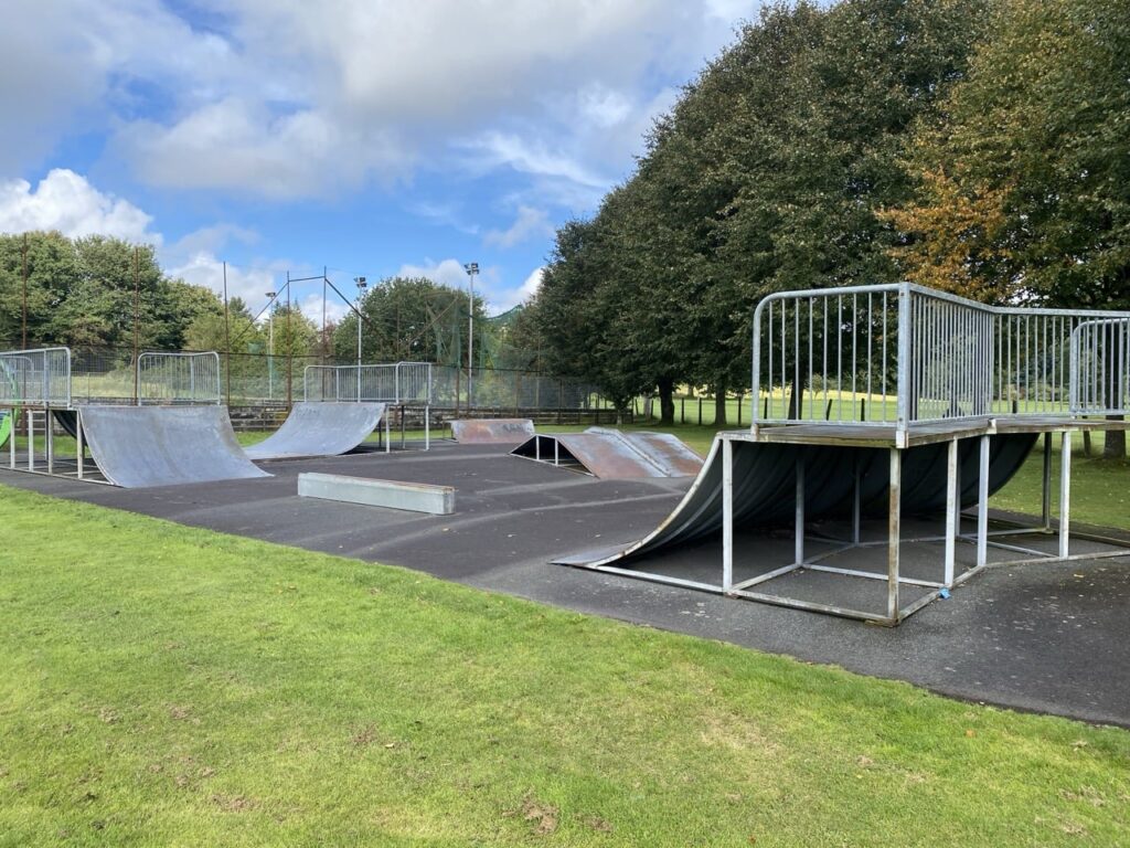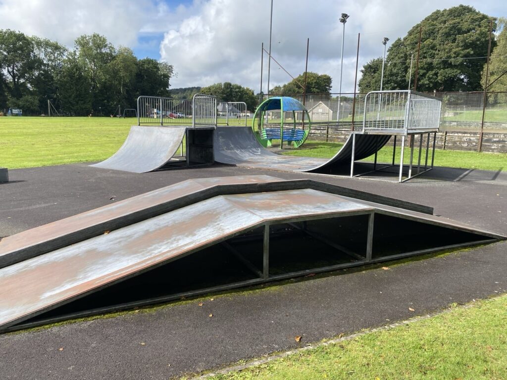 Various metal modular ramps on a tarmac surface. Not really fit for purpose these days but probably OK if you live in Newton Stewart and are desperate for a skate. The 'rail' over the driveway is about 2 inches high and the coping on the mini ramp is flush with the transition and the platform so nothing to pop off of. The mini ramp (the classic 3 feet high 12 feet wide) actually looks usable, and the quarters aren't terrible but the ground surface is. Not really worth seeking out considering Stranraer and Glenluce are within driving distance.